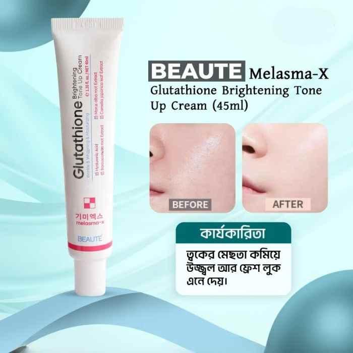 Beaute Melasma-X Glutathione Brightening Tone Up Cream একটি উন্নতমানের স্কিন ব্রাইটেনিং ক্রিম যা বিশেষভাবে তৈরি করা হয়েছে মেলাসমা ও পিগমেন্টেশন সমস্যা সমাধানের জন্য। এতে থাকা গ্লুটাথিওন ও নাইয়াসিনামাইড ত্বকের রঙ উজ্জ্বল করতে সহায়তা করে, এবং ইনস্ট্যান্ট টোন আপ প্রযুক্তির কারণে ব্যবহার সঙ্গে সঙ্গেই ফর্সা ও গ্লোয়িং লুক পাওয়া যায়। এটি স্কিনে হালকা ও আরামদায়ক, যা ডেইলি ইউজের জন্য আদর্শ।
