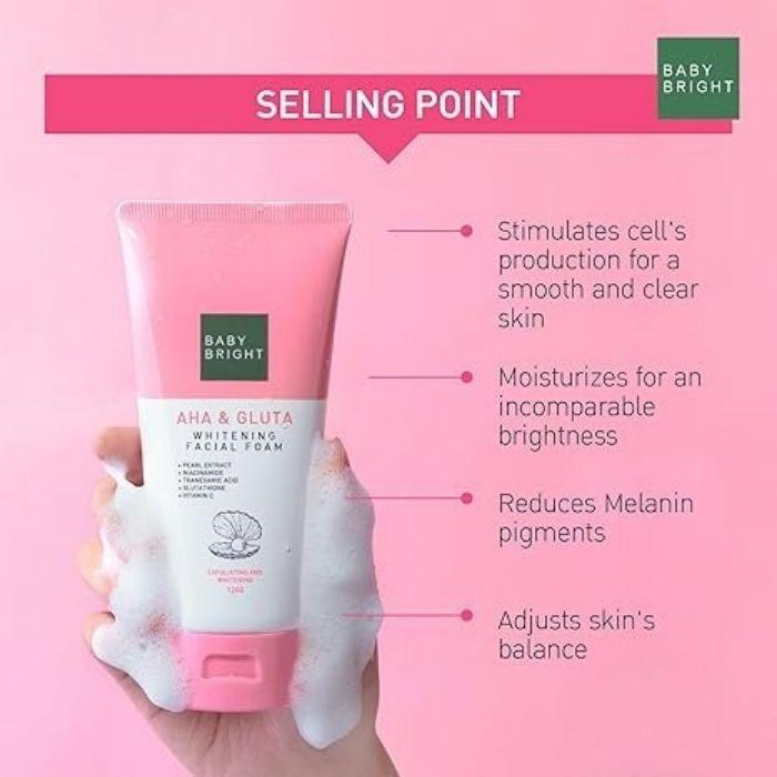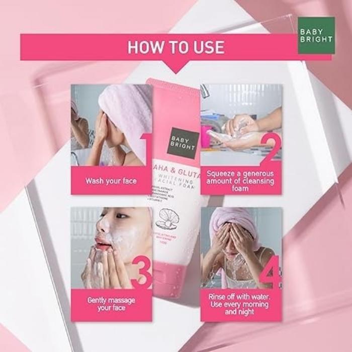 Baby Bright AHA Gluta facial foam, whitening facial foam, glycolic acid face wash, glutathione cleanser, tranexamic acid face wash, pearl extract cleanser